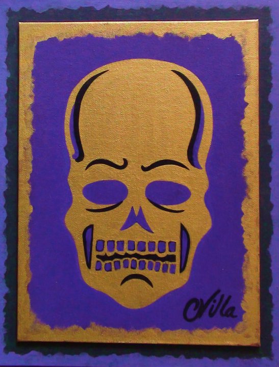 Purple and Gold Acrylic painting of a legendary Conehead on double canvas board. First in a series of Skull paintings reflecting Legendary and Mythological themes from Native American and Celtic cultures.