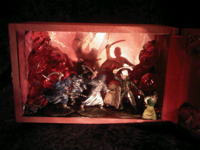 have produced many different playsets of what I like to call interactive dioramas. They are made partly from found objects, handpainted toy soldiers and collage. One series of playsets present the many exploits of Major Vostok, a steampunk adventurer.